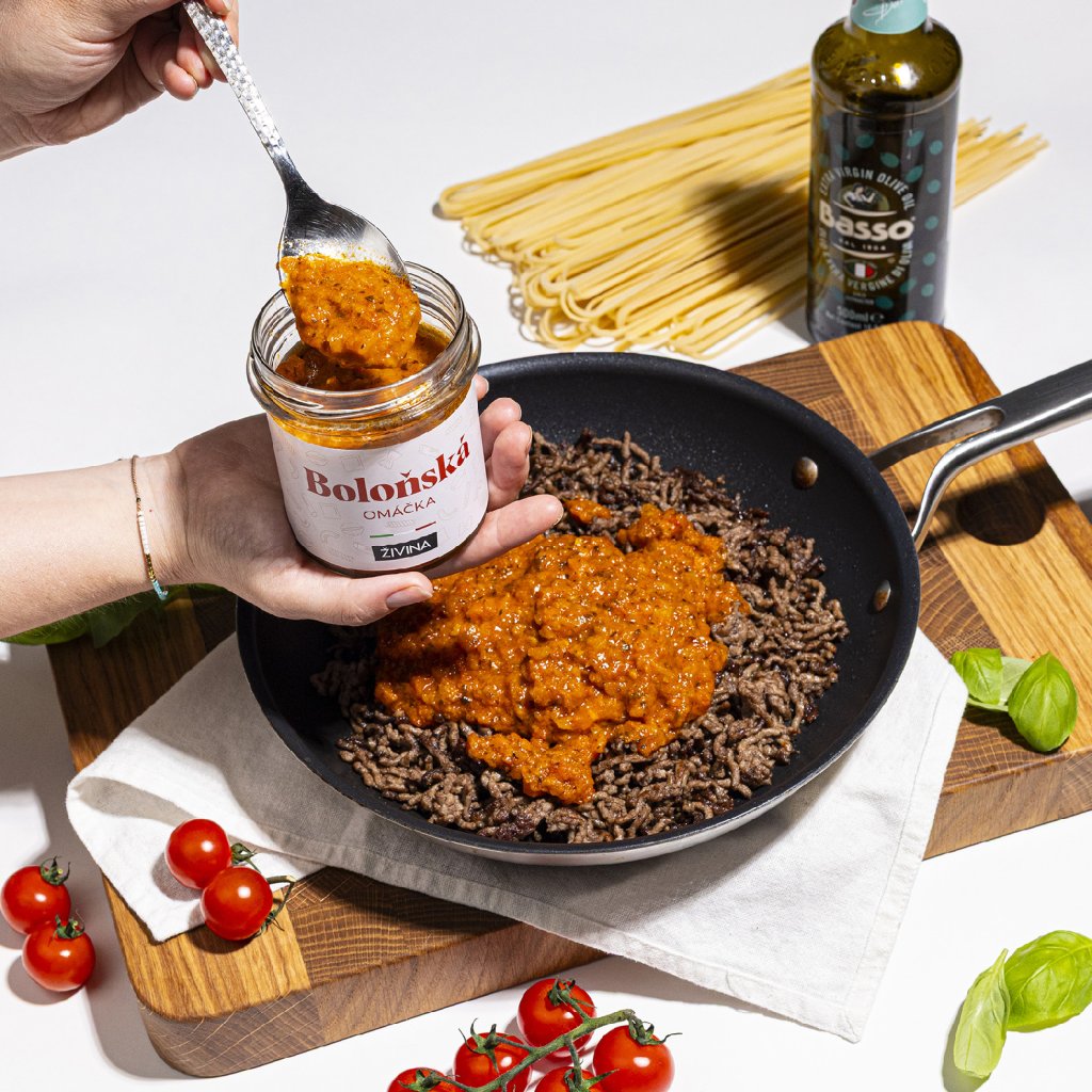 Omáčka je ideální na špagety, lasagne, zapékané pokrmy nebo pizzu. Stačí otevřít sklenici, zředit 1:1 vodou nebo vývarem a prohřát. Hodí se i jako základ na zeleninové ragú nebo do směsí s rostlinným mletým masem. Nikdo vám ale samozřejmě nebrání přidat si do ní mleté hovězí maso od vašeho oblíbeného řezníka.