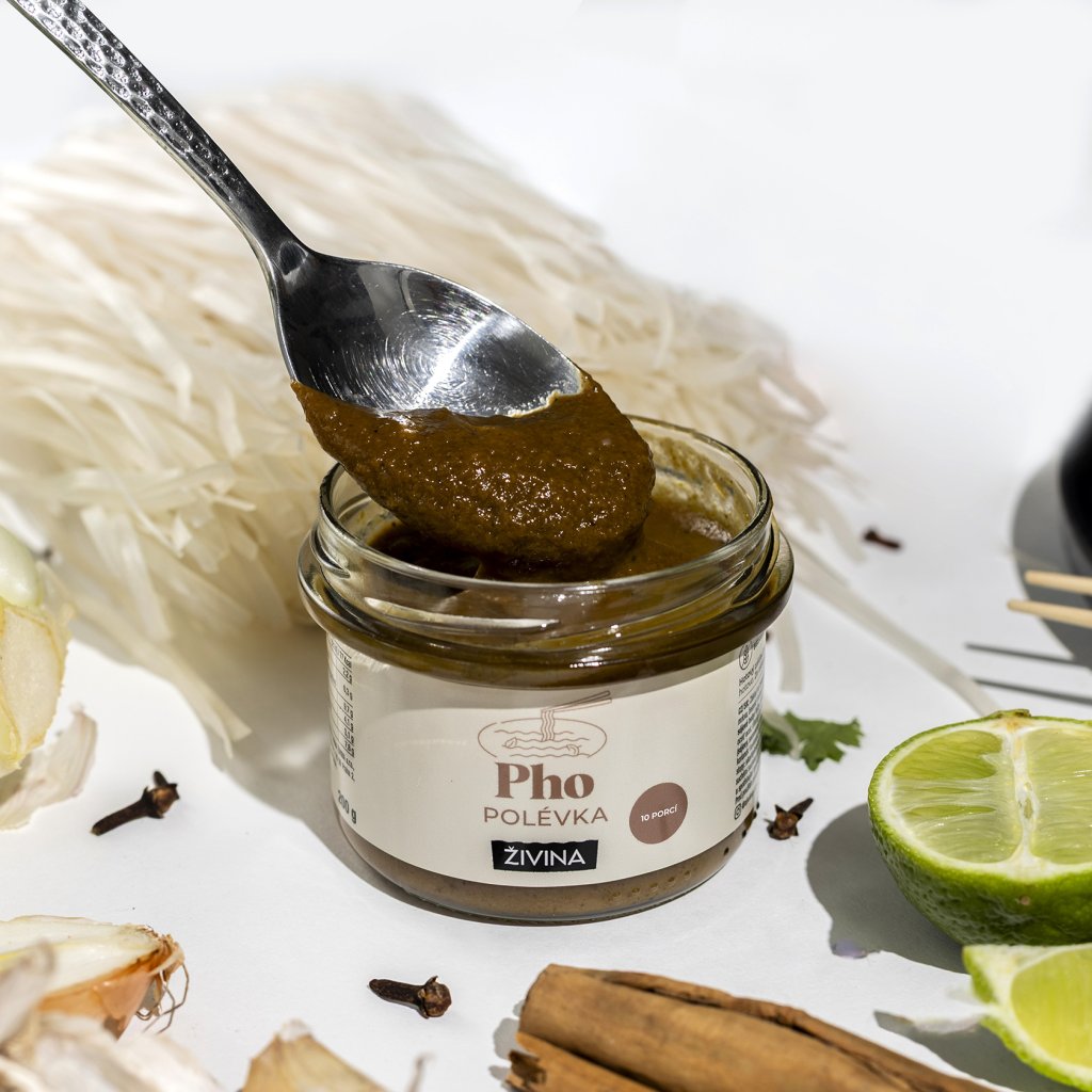 Pho bez zdlouhavého vaření? Ano, jde to! V Živině jsme vytvořili koncentrovaný základ z pečené kořenové zeleniny, shiitake hub, řasy wakame a voňavého koření, který vás přenese rovnou do ulic Hanoje.