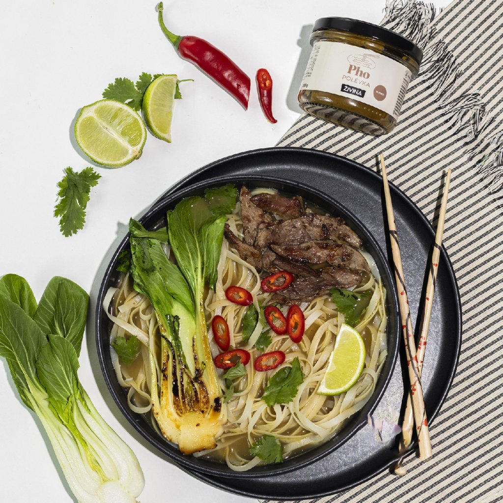 Stačí použít koncentrovaný základ Pho polévky od Živiny – díky směsi pečené zeleniny, shiitake a koření máte hotový autentický vývar během pár minut. Mňam!